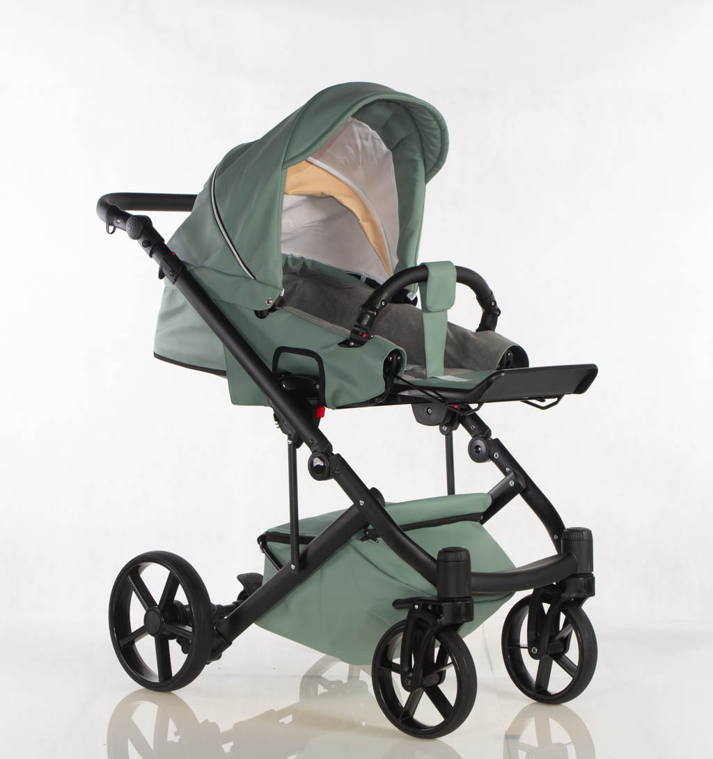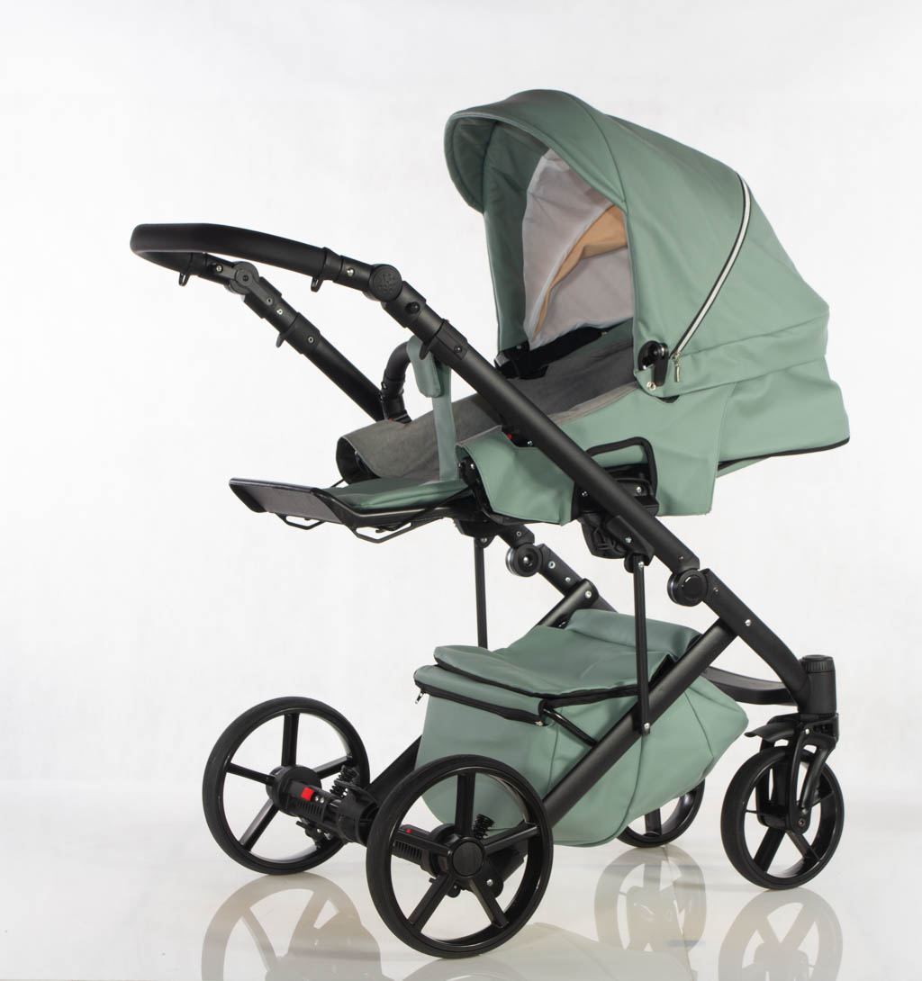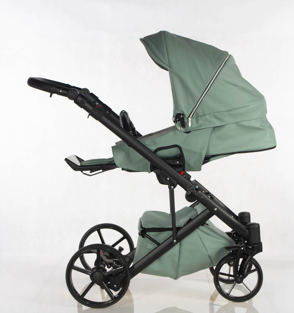 Wielofunkcyjny wózek głęboko-spacerowy wykonany z eko skóry z fotelikiem samochodowym.